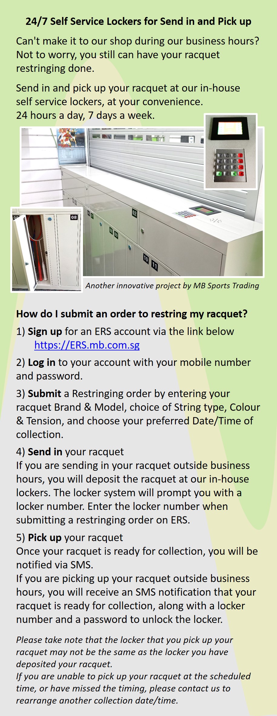 - send in and Pick up racquet using 24/7 In-House self service locker.